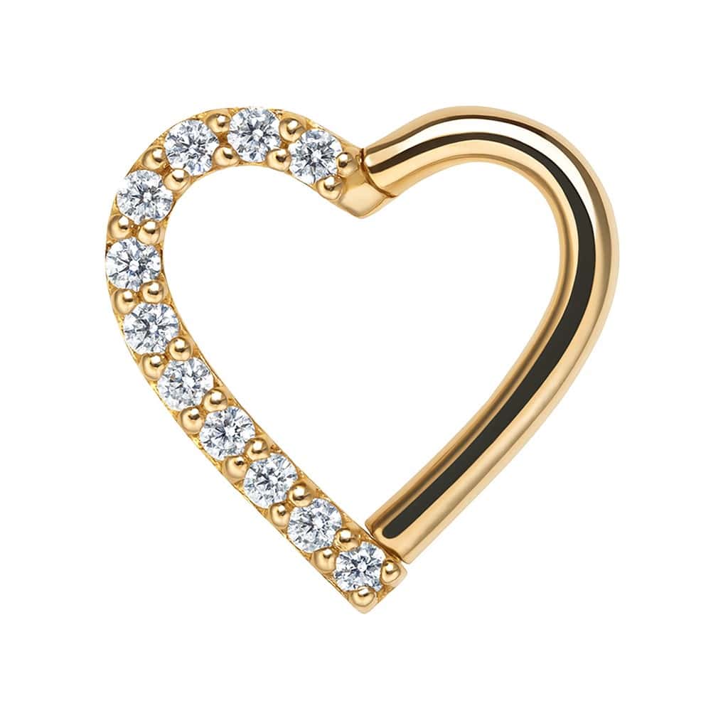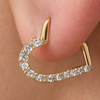 עגיל חישוק בצורת לב, עשוי זהב צהוב 14 קראט ומשובץ יהלומים זוהרים. עיצוב נשי ועדין שמתאים לפירסינג בלוב, קונץ או הליקס. פירסינג יהלומים מזהב (משקל יהלומים כולל 0.10 קראט) בצבע D וניקיון יהלום VS1.