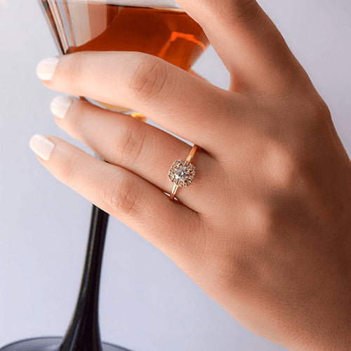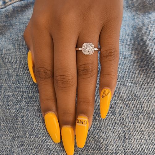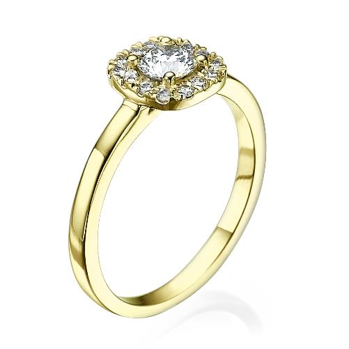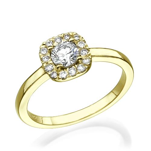 טבעת אירוסין דומיניק מעוצבת בהשראת יהלומי הקושיין המרובעים. מסביב ליהלום הראשי משובצים 15 יהלומים עגולים המשלימים את המראה הנוצץ. טבעת אירוסין זהב צהוב עם יהלום מרכזי במשקל: 0.41 קראט (משקל יהלומים כולל 0.71 קראט) בצבע F וניקיון יהלום SI1.
