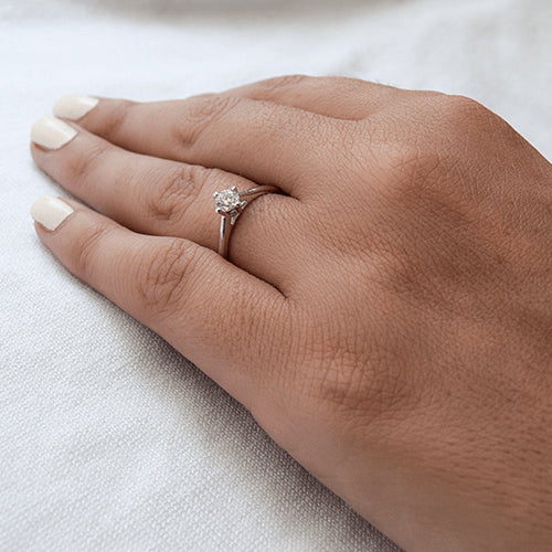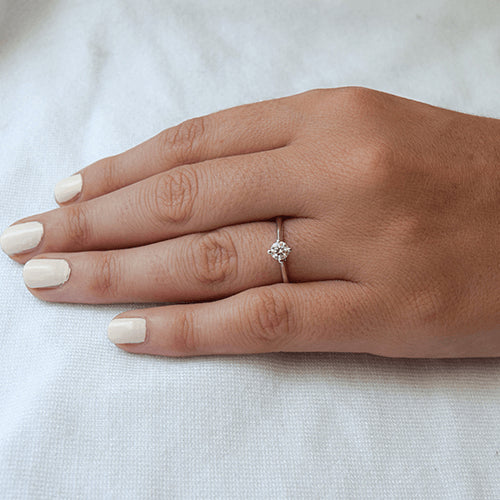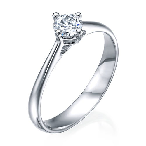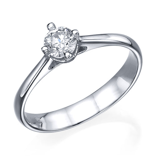 טבעת יהלום לאירוסין בעיצוב סוליטר קלאסי המשובץ יהלום בחיתוך עגול המוחזק בצורה מיוחדת. טבעת אירוסין זהב לבן עם יהלום מרכזי במשקל: 0.35 קראט (משקל יהלומים כולל 0.35 קראט) בצבע F וניקיון יהלום SI1.