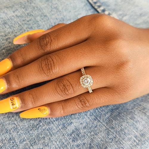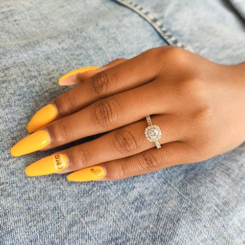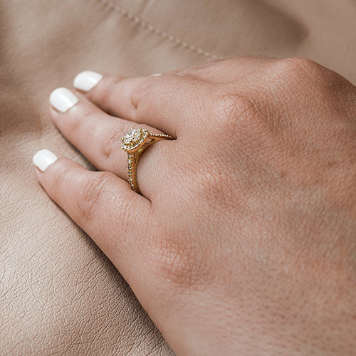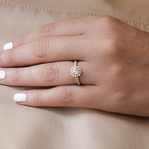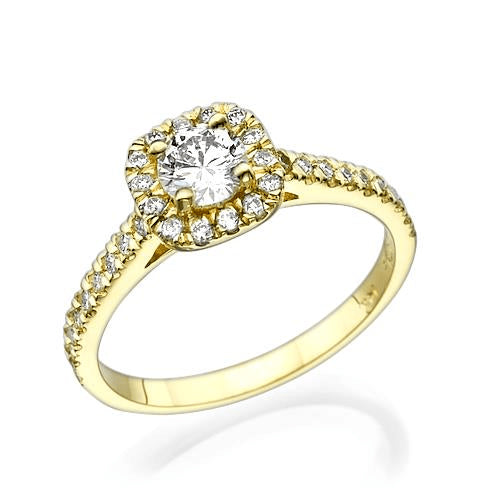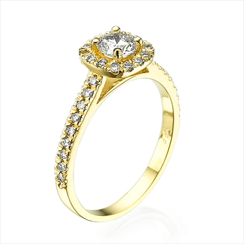 טבעת יהלומים מרשימה ומעוצבת המשלבת סגנון קלאסי ויוקרתי ביחד. בראש הטבעת משובץ יהלום עגול המוקף 14 יהלומים מסביבו המעניקים לטבעת מראה של טבעת בעיצוב קושיין www.DiamondF.co.il. טבעת אירוסין זהב צהוב עם יהלום מרכזי במשקל: 0.41 קראט (משקל יהלומים כולל 0.71 קראט) בצבע F וניקיון יהלום SI1.
