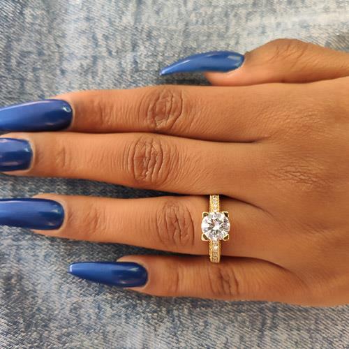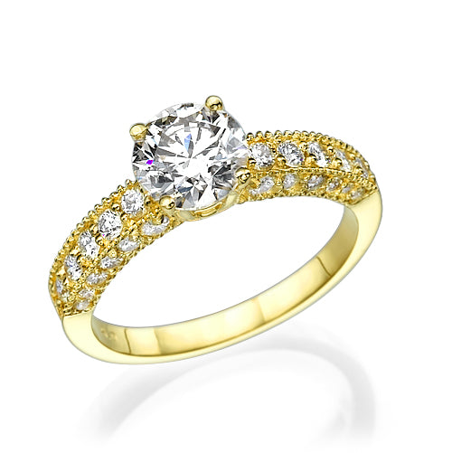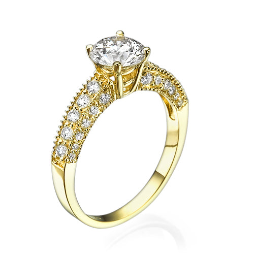 טבעת יהלומים "אווה" היא טבעת מלכותית המתאימה לנשים מיוחדות. את הטבעת מקיפים עשרות יהלומים במגוון גדלים שונים ויהלום ענק בניקיון משודרג בראש הטבעת. טבעת אירוסין זהב צהוב עם יהלום מרכזי במשקל: 1.03 קראט (משקל יהלומים כולל 1.78 קראט) בצבע F וניקיון יהלום SI1.