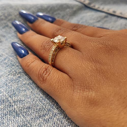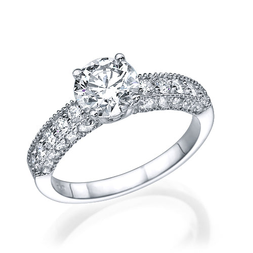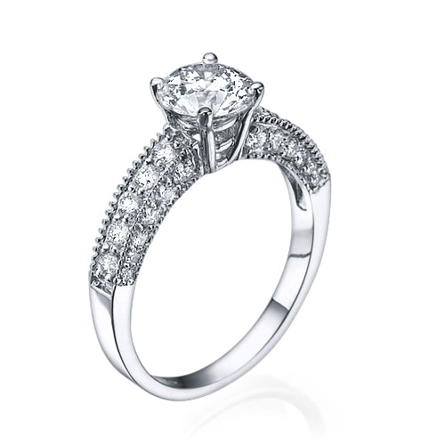 טבעת יהלומים מרהיבה בעיצוב וינטאג מלכותי. בראש הטבעת משובץ יהלום מרכזי במשקל 1.03 קראט המלווה בשיבוץ נוסף של יהלומים בשלל גדלים לכל שיפולי הטבעת. טבעת אירוסין זהב לבן עם יהלום מרכזי במשקל: 1.03 קראט (משקל יהלומים כולל 1.78 קראט) בצבע F וניקיון יהלום SI1.