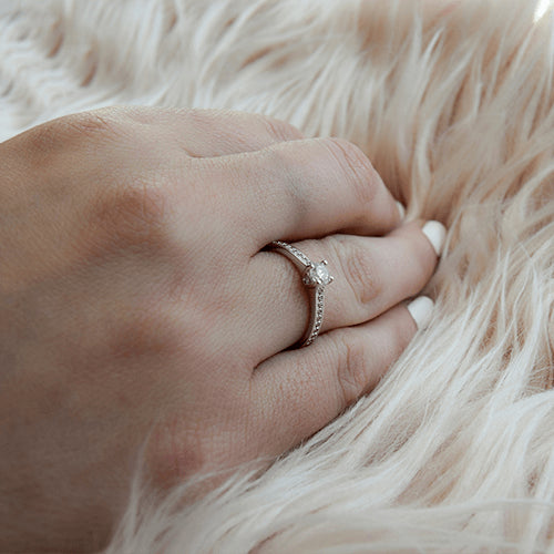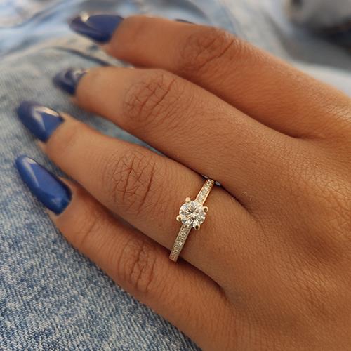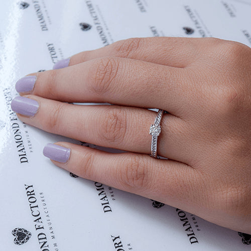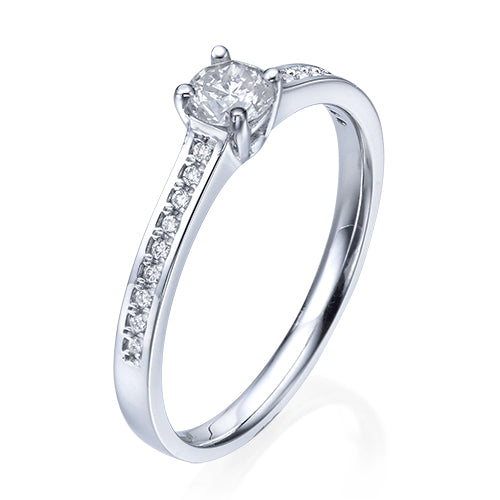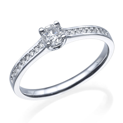 טבעת יהלום בעיצוב קלאסי המשלב שיבוץ של 18 יהלומים בצידי הטבעת ויהלום מרכזי גדול המוחזק בעזרת 4 שיניים. טבעת אירוסין זהב לבן עם יהלום מרכזי במשקל: 0.31 קראט (משקל יהלומים כולל 0.51 קראט) בצבע F וניקיון יהלום SI1.