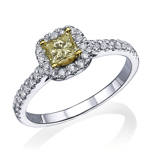 טבעת יהלומים היילו המשובצת יהלום פרינסס בצבע "פנסי צהוב" טבעי ונוצץ. טבעת מושלמת לאוהבי התכשיטים המיוחדים. טבעת אירוסין זהב לבן עם יהלום מרכזי במשקל: 0.42 קראט (משקל יהלומים כולל 0.72 קראט) בצבע FY וניקיון יהלום SI1.