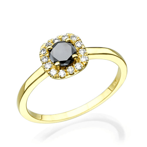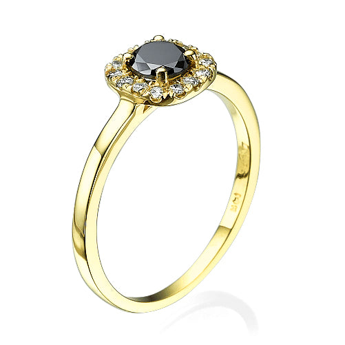 טבעת יהלומים מעוצבת בהשראת קולקציית היהלומים השחורים של דיימונד פקטורי. בראש הטבעת משובץ יהלום עגול בצבע שחור ומסביבו יהלומים שקופים המדגישים את הצבע המיוחד של היהלום השחור. טבעת אירוסין זהב צהוב עם יהלום מרכזי במשקל: 0.41 קראט (משקל יהלומים כולל 0.71 קראט) בצבע Bla וניקיון יהלום VVS.