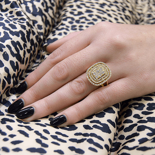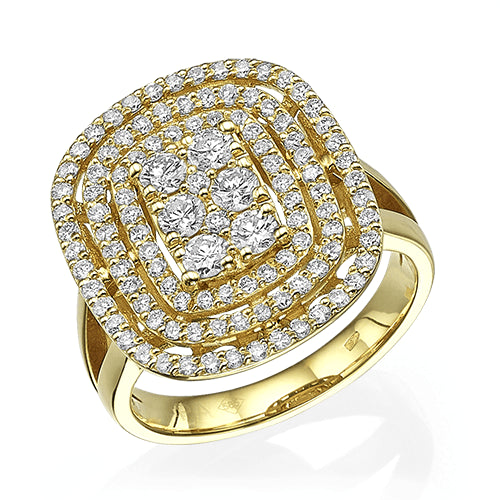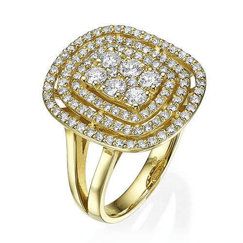 טבעת זינה היא טבעת מרשימה המשובצת יהלומים במגוון גדלים בכל הטבעת אשר מעניקים מראה נוצץ ויוקרתי. טבעת אירוסין זהב צהוב (משקל יהלומים כולל 1.25 קראט) בצבע F וניקיון יהלום VS2.