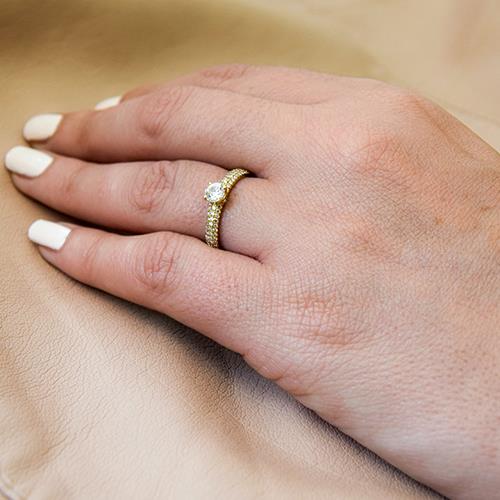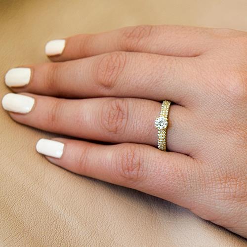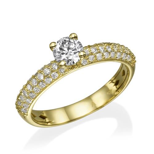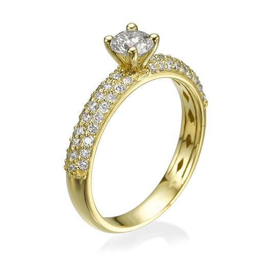 טבעת יהלומים מרשימה בשיבוץ כ- 50 יהלומים ב - 3 שורות צפופות בטכניקת פאווה ויהלום עגול המשובץ בראש הטבעת. טבעת אירוסין זהב צהוב עם יהלום מרכזי במשקל: 0.42 קראט (משקל יהלומים כולל 0.92 קראט) בצבע F וניקיון יהלום SI1.