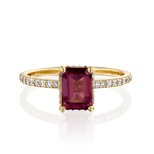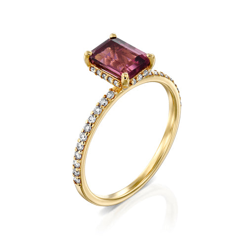 טבעת זהב צהוב עם אבן מורגנייט טבעית בחיתוך מלבני ושורת יהלומים