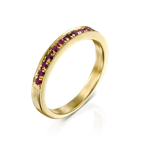 טבעת זהב צהוב משובצת שורת אבני רובי טבעיות בגוון אדום עמוק