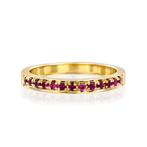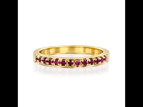 טבעת זהב צהוב המשובצת שורת אבני רובי טבעיות בגוון אדום בולט האבנים מסודרות בקו אחיד המעניק נראות ישרה ונעימה לעין הצבע העמוק של הרובי מוסיף חום ומדגיש את הזהב הצהוב הטבעת מתאימה לשילוב יומיומי או לאירוע ויכולה לעמוד בפני עצמה או ליד טבעות נוספות התכשיט מעניק תחושה מאוזנת עם מגע צבעוני ברור