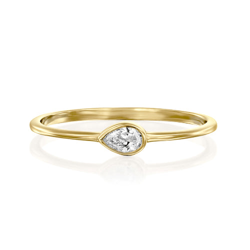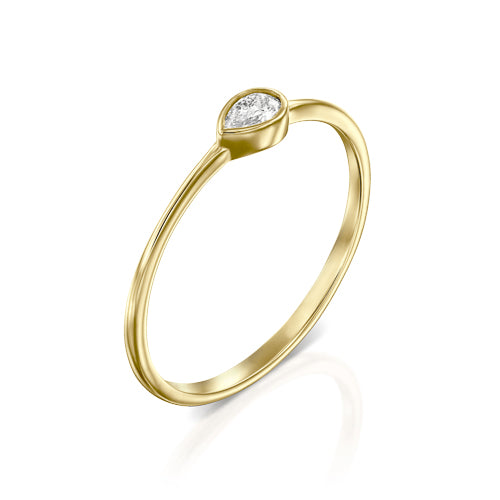 טבעת יהלום דגם סוליטר עדינה מאוד אשר משובצת יהלום במשקל עשירית קראט בצורת טיפה. את היהלום עוטף שיבוץ מוקפד בטכניקת "BEZEL" המעצים את הברק והניצוץ של היהלום. טבעת אירוסין זהב צהוב עם יהלום מרכזי במשקל: 0.10 קראט (משקל יהלומים כולל 0.10 קראט) בצבע D וניקיון יהלום VS1.