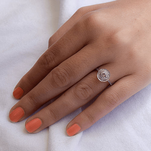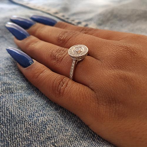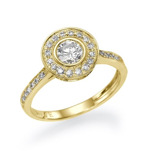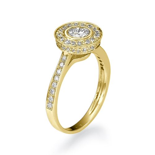 טבעת אירוסין יוקרתית בשיבוץ Halo המשלב 53 יהלומים המשובצים מסביב לכל הטבעת ומסביב ליהלום המשובץ במרכז הטבעת. אפשר לבחור יהלום מרכזי במשקל 0.40 - 0.60 בכל דרגת צבע יהלום ובכל דרגת ניקיון יהלום. טבעת אירוסין זהב צהוב עם יהלום מרכזי במשקל: 0.41 קראט (משקל יהלומים כולל 0.93 קראט) בצבע F וניקיון יהלום SI1.