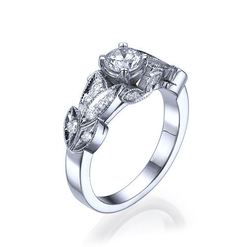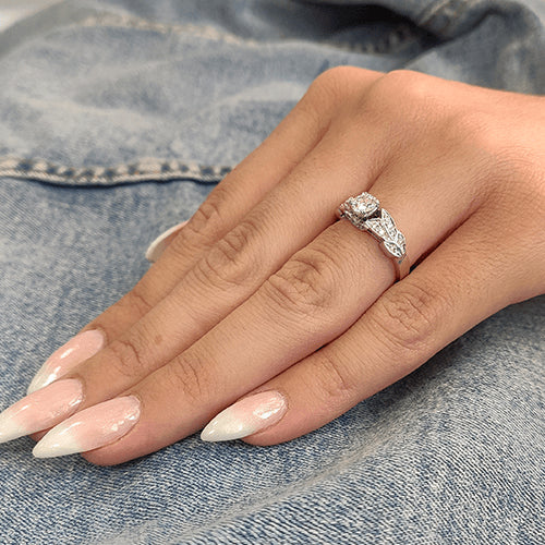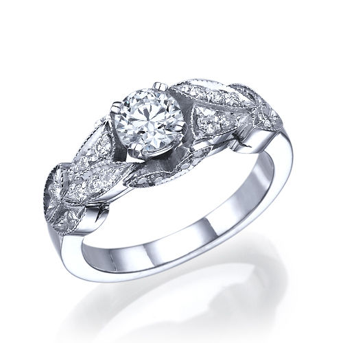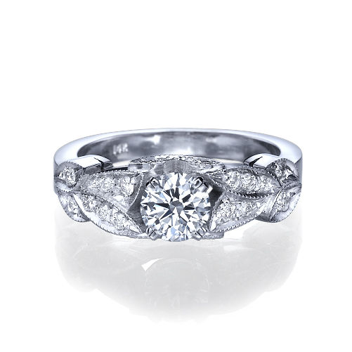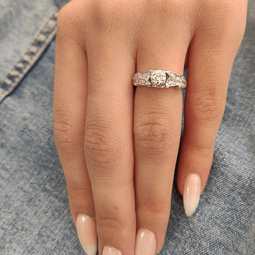 תכירו את קיירה - טבעת אירוסין עשירה בזהב ובעלת מראה עתיק ומיוחד. טבעת אירוסין זו מתאימה לנשים האוהבות את מראה הוינטאג המקורי עם הניחוחות העתיקים. טבעת אירוסין זהב לבן עם יהלום מרכזי במשקל: 0.51 קראט (משקל יהלומים כולל 0.75 קראט) בצבע E וניקיון יהלום SI1.