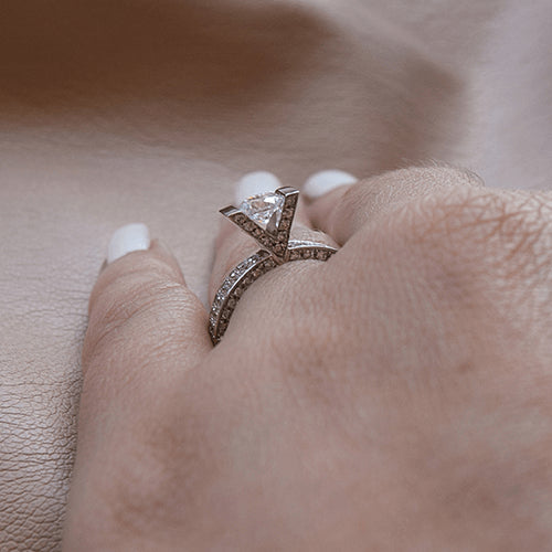 טבעת אירוסין זהב צהוב בשיבוץ V האוחז ביהלום שנראה כאילו הוא מוחזק באוויר. בנוסף משובצות על הטבעת עוד 88 יהלומים לכל אורכה במספר שורות המוסיפות המון ברק. ניתן לשבץ בטבעת ויקטוריה יהלום מרכזי במשקל 0.35 - 0.75 קראט. טבעת אירוסין זהב צהוב עם יהלום מרכזי במשקל: 0.41 קראט (משקל יהלומים כולל 1.01 קראט) בצבע F וניקיון יהלום SI1.