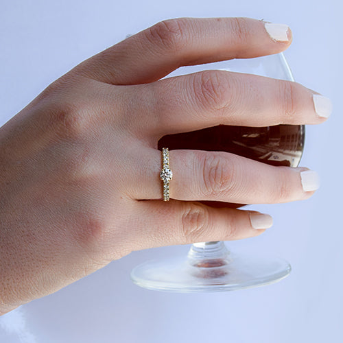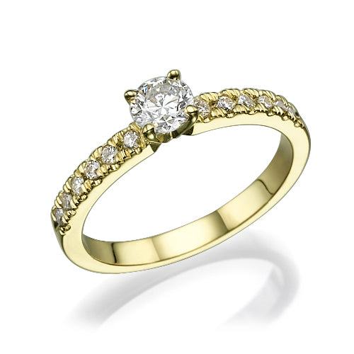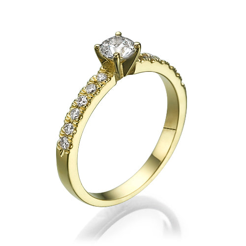 מלודי היא טבעת יהלומים מדהימה המשובצת 12 יהלומים בצידי הטבעת בטכניקה ייחודית המעניקה המון ברק וניצוץ המאירים את היהלום הגדול אשר משובץ בראשה לקריאה נוספת אודות כיצד לבחור טבעת אירוסין לחצו כאן. טבעת אירוסין זהב צהוב עם יהלום מרכזי במשקל: 0.31 קראט (משקל יהלומים כולל 0.56 קראט) בצבע F וניקיון יהלום SI1.