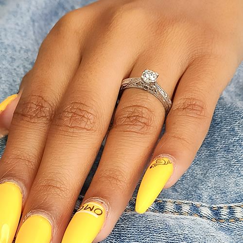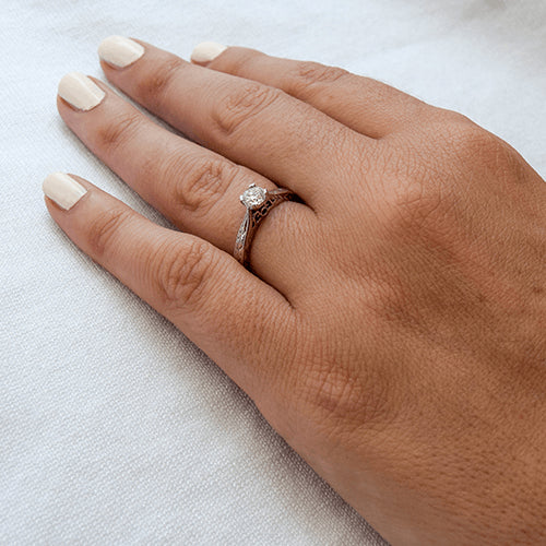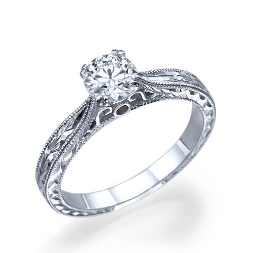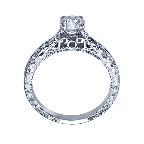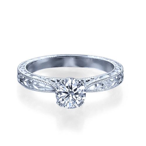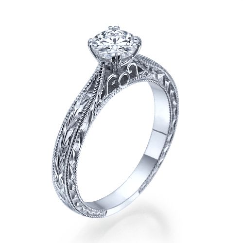 טבעת אירוסין וינטאג זהב לבן משובצת יהלומים 0.42 קראט הטבעת מגדירה מחדש את סגנון הוינטאג. טבעת זו עשוייה חריטה ידנית ב-100%בטבעת זו ניתן לשבץ יהלום מרכזי במשקל 0.40 - 1.00 קראט בכל דרגות האיכות. טבעת אירוסין זהב לבן עם יהלום מרכזי במשקל: 0.42 קראט (משקל יהלומים כולל 0.42 קראט) בצבע E וניקיון יהלום SI1.