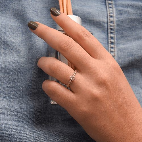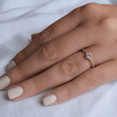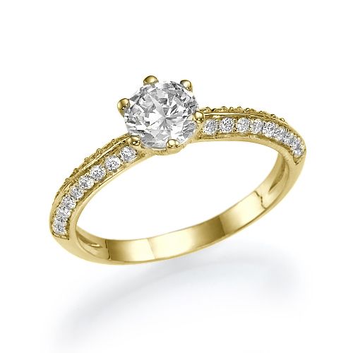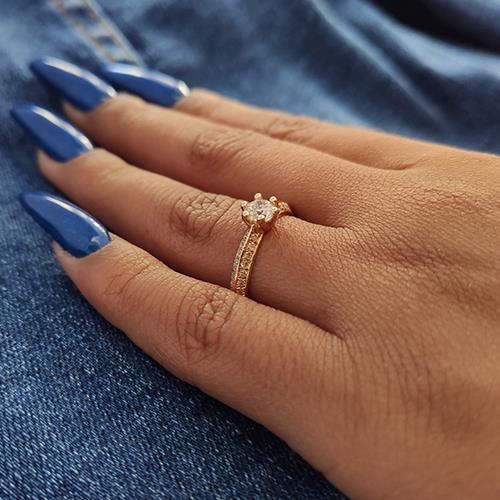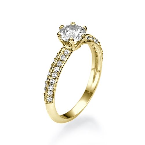 טבעת אירוסין מרשימה ומרהיבה המשובצת 36 יהלומים נוצצים מסביב לכל הטבעת באופן שיבוץ מיוחד שמראה את היהלומים מכל זווית שמסתכלים על הטבעת. בראש הטבעת משובץ יהלום עגול בשיבוץ 6 שיניים. אפשר לבחור יהלום מרכזי בטבעת קתרין במשקל 0.40 - 1.50 קראט. טבעת אירוסין זהב צהוב עם יהלום מרכזי במשקל: 0.41 קראט (משקל יהלומים כולל 0.78 קראט) בצבע F וניקיון יהלום SI1.
