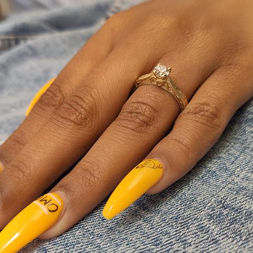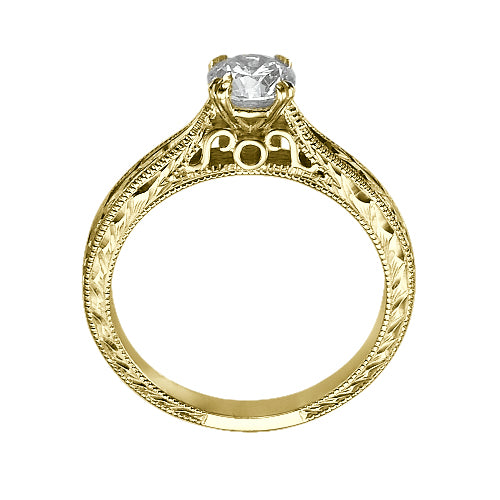 טבעת אירוסין וינטאג זהב צהוב זו היא טבעת מיוחדת מאוד. החריטה של הטבעת מתבצעת ב-100% עבודת יד להענקת המראה העתיק והמרהיב. עיצוב זה הוא ייחודי לדיימונד פקטורי ומתאים למי שמחפש טבעת בעיצוב המשלב סגנון עתיק ומודרני כאחד. ניתן לשבץ בטבעת זו יהלום מרכזי במשקל 0.40 - 1.00 קראט בכל דרגת צבע וניקיון. טבעת אירוסין זהב צהוב עם יהלום מרכזי במשקל: 0.42 קראט (משקל יהלומים כולל 0.42 קראט) בצבע E וניקיון יהלום SI1.