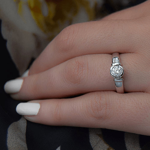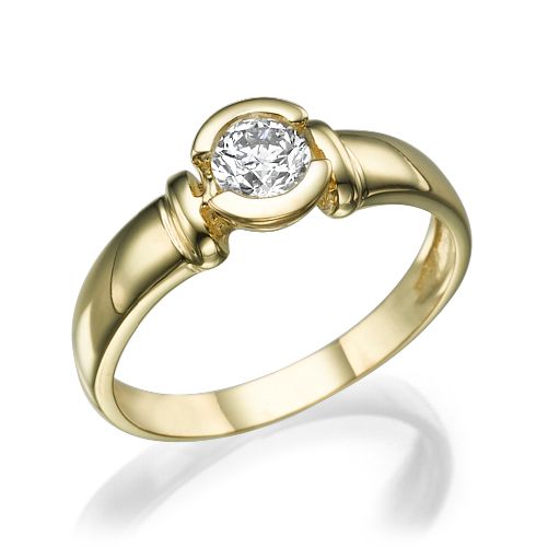טבעת אירוסין סוליטר בשיבוץ Bezel עגולה אשר היהלום משובץ בה בצורה שקועה המדגישה את הברק שלו ומעניקה לו מימד נוסף של ניצנוץ. טבעת אירוסין זהב צהוב עם יהלום מרכזי במשקל: 0.41 קראט (משקל יהלומים כולל 0.41 קראט) בצבע F וניקיון יהלום SI1.