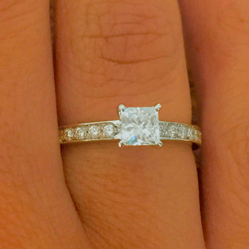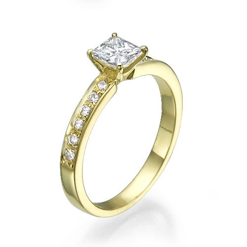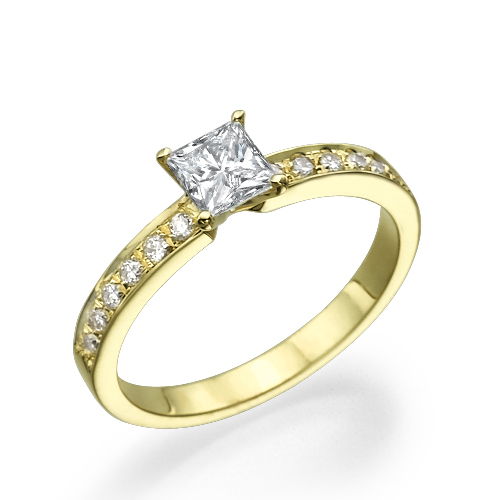 טבעת אירוסין קלאסית בשיבוץ יהלום מרובע Princess Cut בשיבוץ נקי של 4 שיניים ובתוספת 12 יהלומים נוצצים המשובצים בצידי הטבעת. בטבעת לנה ניתן לשבץ יהלום מרכזי במשקל 0.40 - 1.00 בכל דרגות האיכות. טבעת אירוסין זהב צהוב עם יהלום מרכזי במשקל: 0.41 קראט (משקל יהלומים כולל 0.65 קראט) בצבע F וניקיון יהלום VS2.