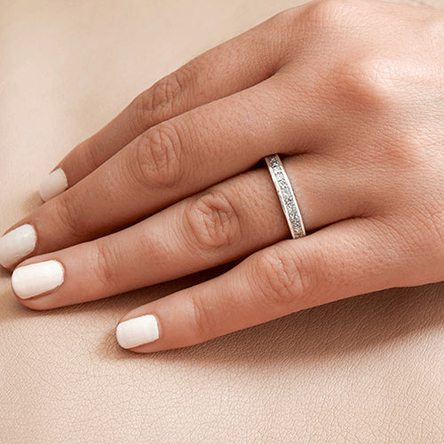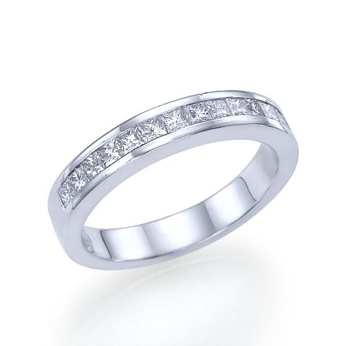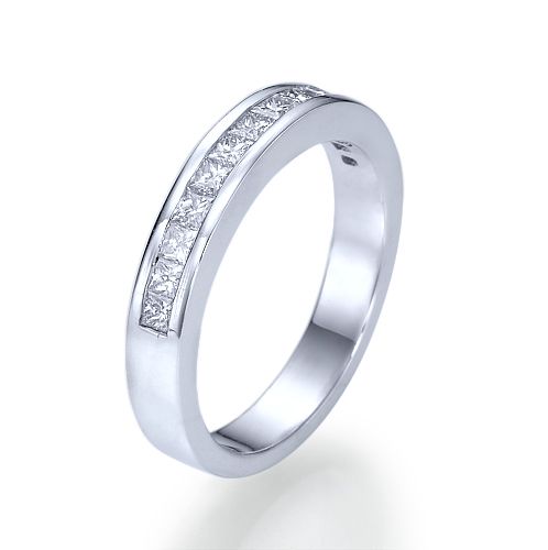 טבעת אירוסין המשובצת 14 יהלומים מרובעים בחיתוך פרינסס בצורה ייחודית המעניקה מראה של משטח יהלומים חלק ללא זהב בין יהלום ליהלום. טבעת אירוסין זהב לבן (משקל יהלומים כולל 0.69 קראט) בצבע D וניקיון יהלום VS1.