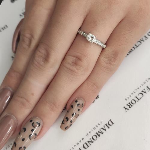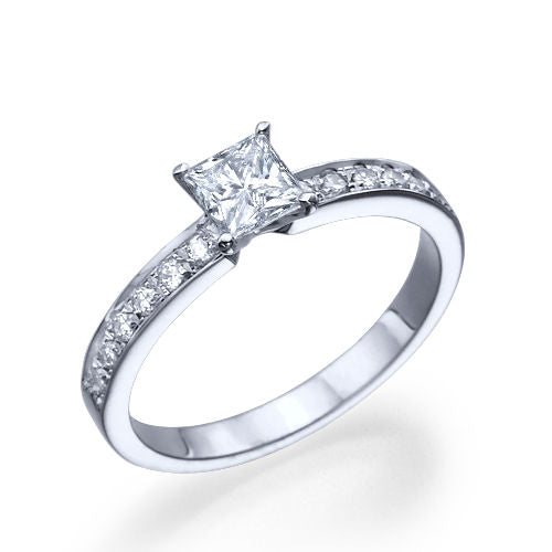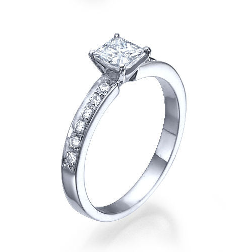טבעת אירוסין המשובצת 12 יהלומים עגולים בצידי הטבעת ויהלום מרכזי גדול בחיתוך מרובע Princess Cut המוחזק על ידי 4 שיניים מזהב. ניתן לשבץ בטבעת לנה יהלום מרכזי במשקל 0.40 - 1.00 קראט בכל דרגות האיכות. טבעת אירוסין זהב לבן עם יהלום מרכזי במשקל: 0.41 קראט (משקל יהלומים כולל 0.65 קראט) בצבע F וניקיון יהלום VS2.