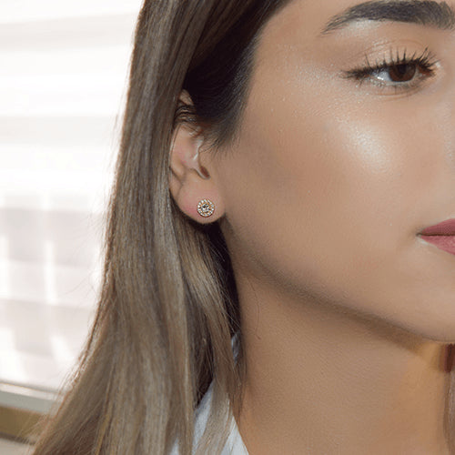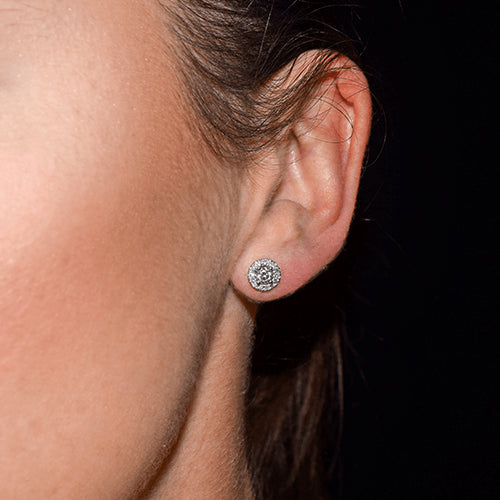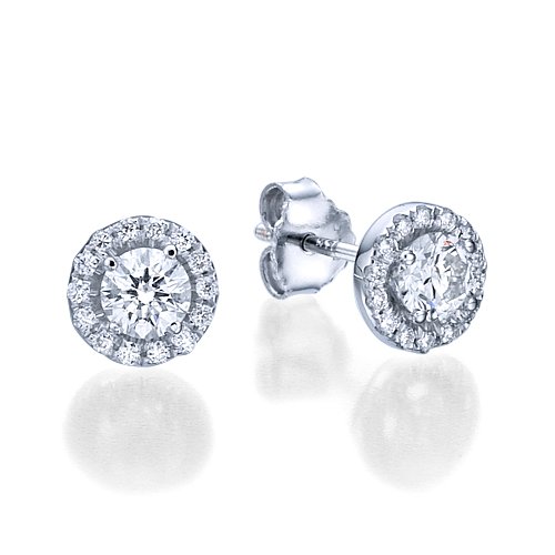 עגילי יהלומים מזהב לבן בעיצוב היילו עם יהלומים טבעיים נוצצים מסביב