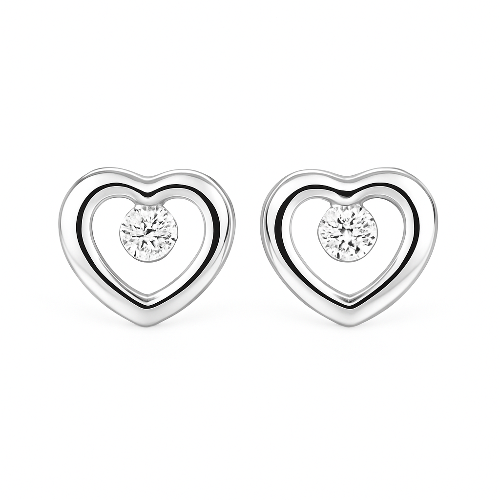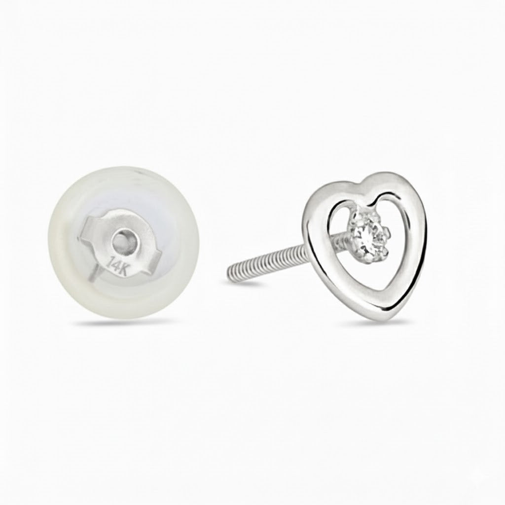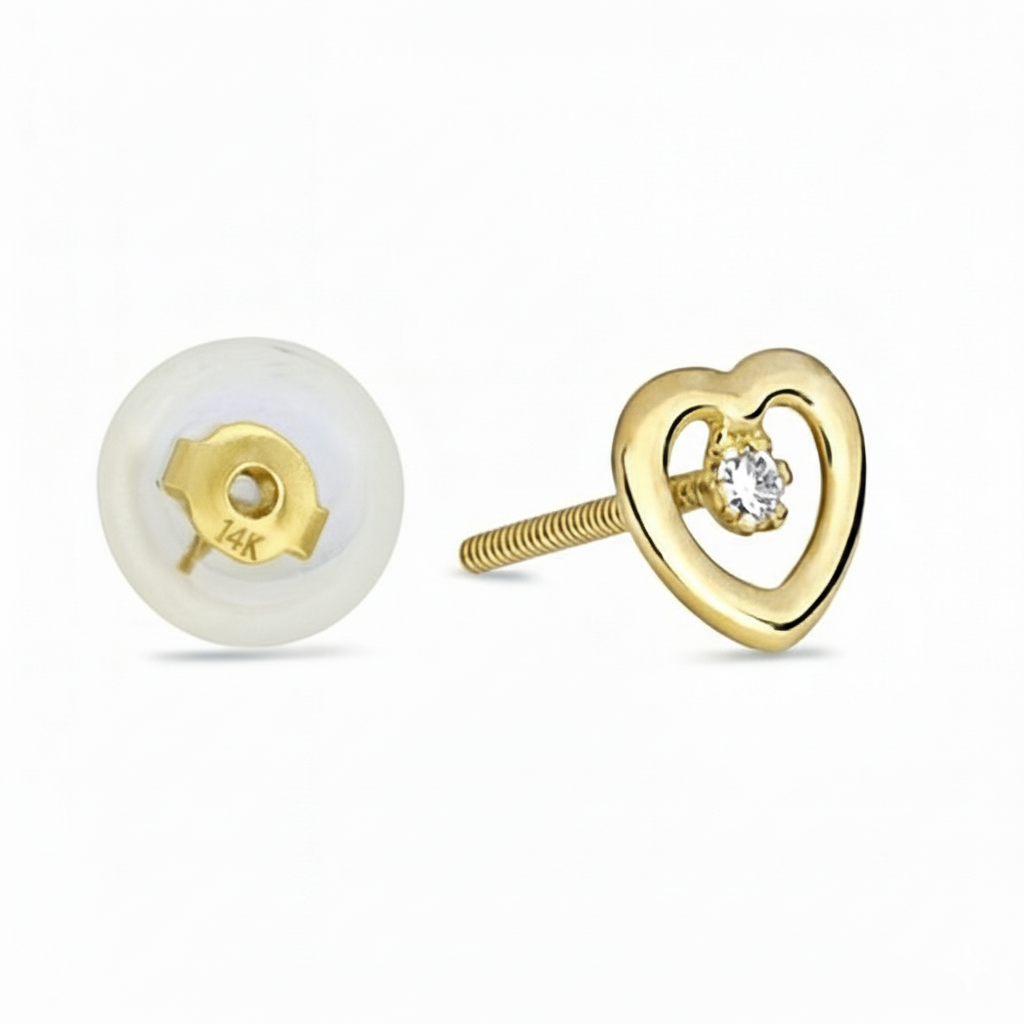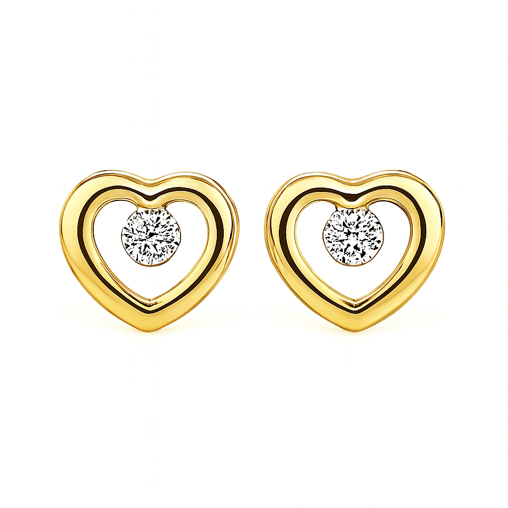 עגילי לב מזהב 14 קראט עם זירקון מעבדה במרכז מוסיפים נגיעת רוך ויוקרה ומתאימים לכל לוק יומיומי או לערב על הדוגמנית מוצג מראה טבעי ונקי