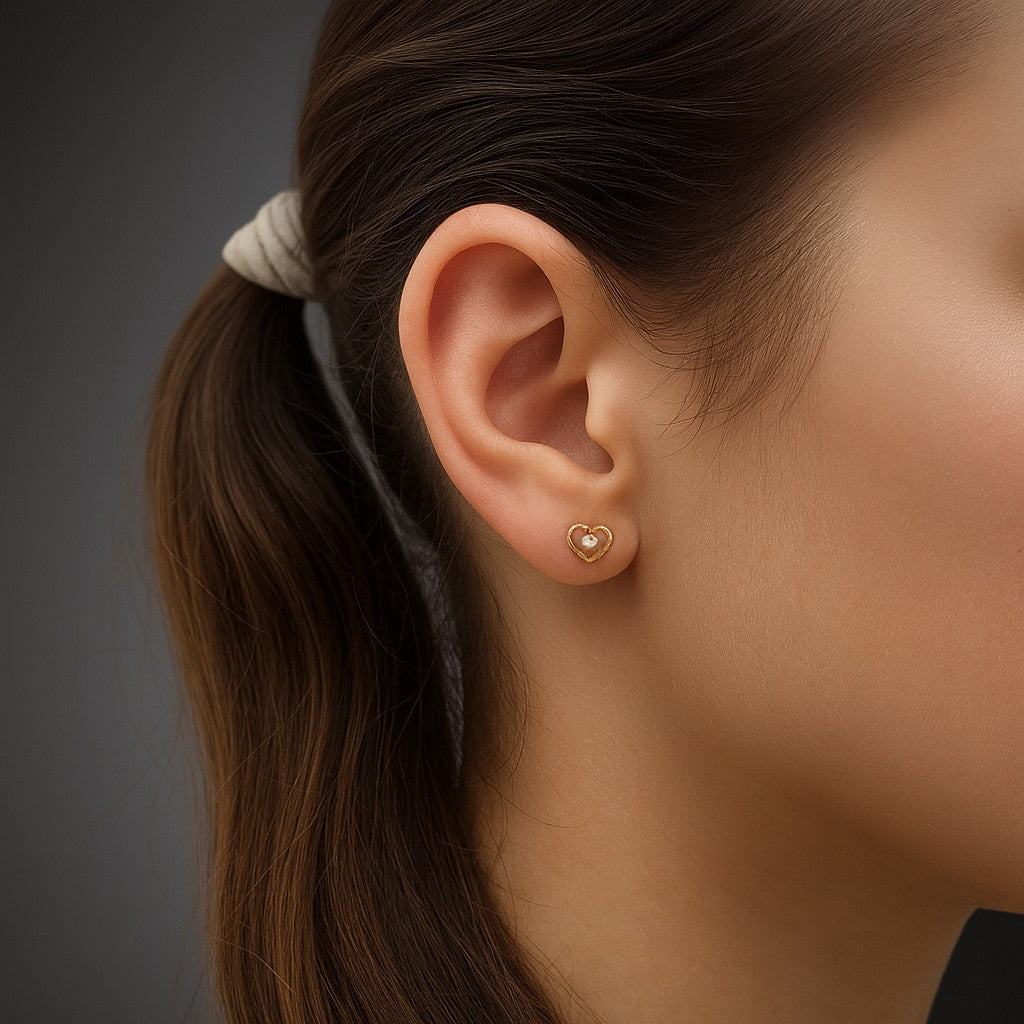 עגילי לב זהב עדינים עם יהלום מעבדה במראה אלגנטי על האוזן