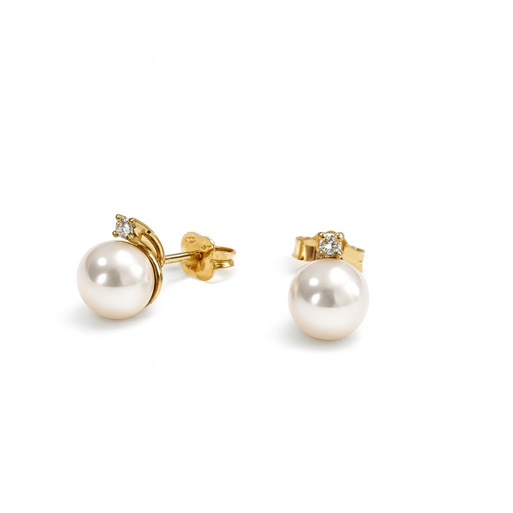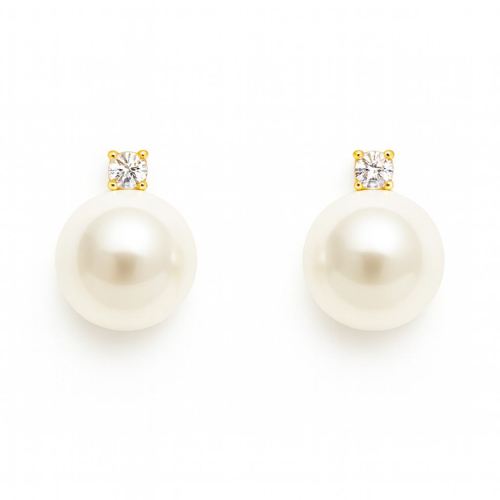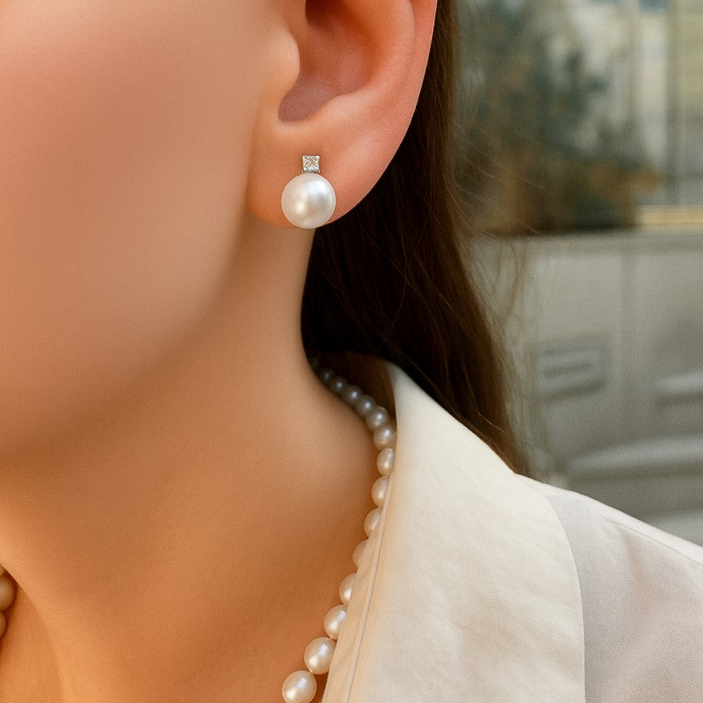 עגילי פנינה צמודים עם יהלום בזהב לבן למראה יוקרתי ועדין