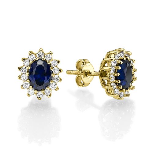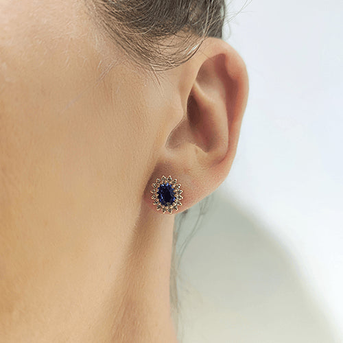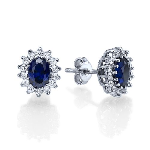 עגילי דיאנה זהב לבן צמודים עם ספירים טבעיות בחיתוך אובלי ויהלומים