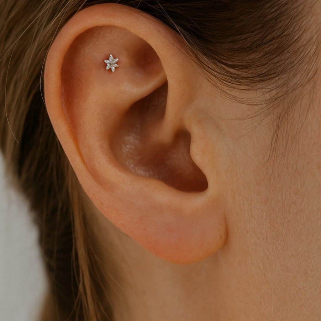 עגיל פרח עשוי זהב לבן בעיצוב נקי ומודרני משובץ יהלום במרכזו מתאים לפירסינג לוב טראגוס הליקס וחלקים נוספים באוזן עשוי מחומרים איכותיים מזהב מלא לשימוש יומיומי מתאים לנשים ונערות שמחפשות עגיל יוקרתי במראה טבעי ועדין קל להרכבה עם סגירה בטוחה מראה קלאסי שמשתלב בכל הופעה. פירסינג יהלומים מזהב (משקל יהלומים כולל 0.01 קראט) בצבע D וניקיון יהלום VS1.