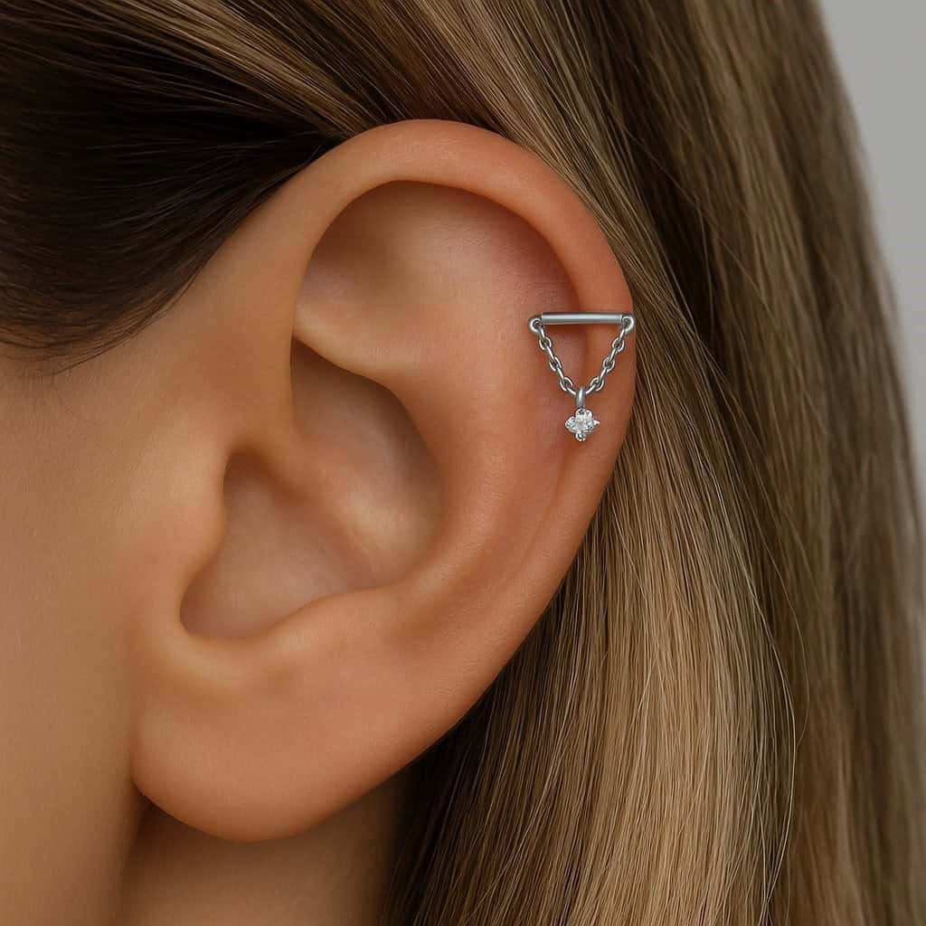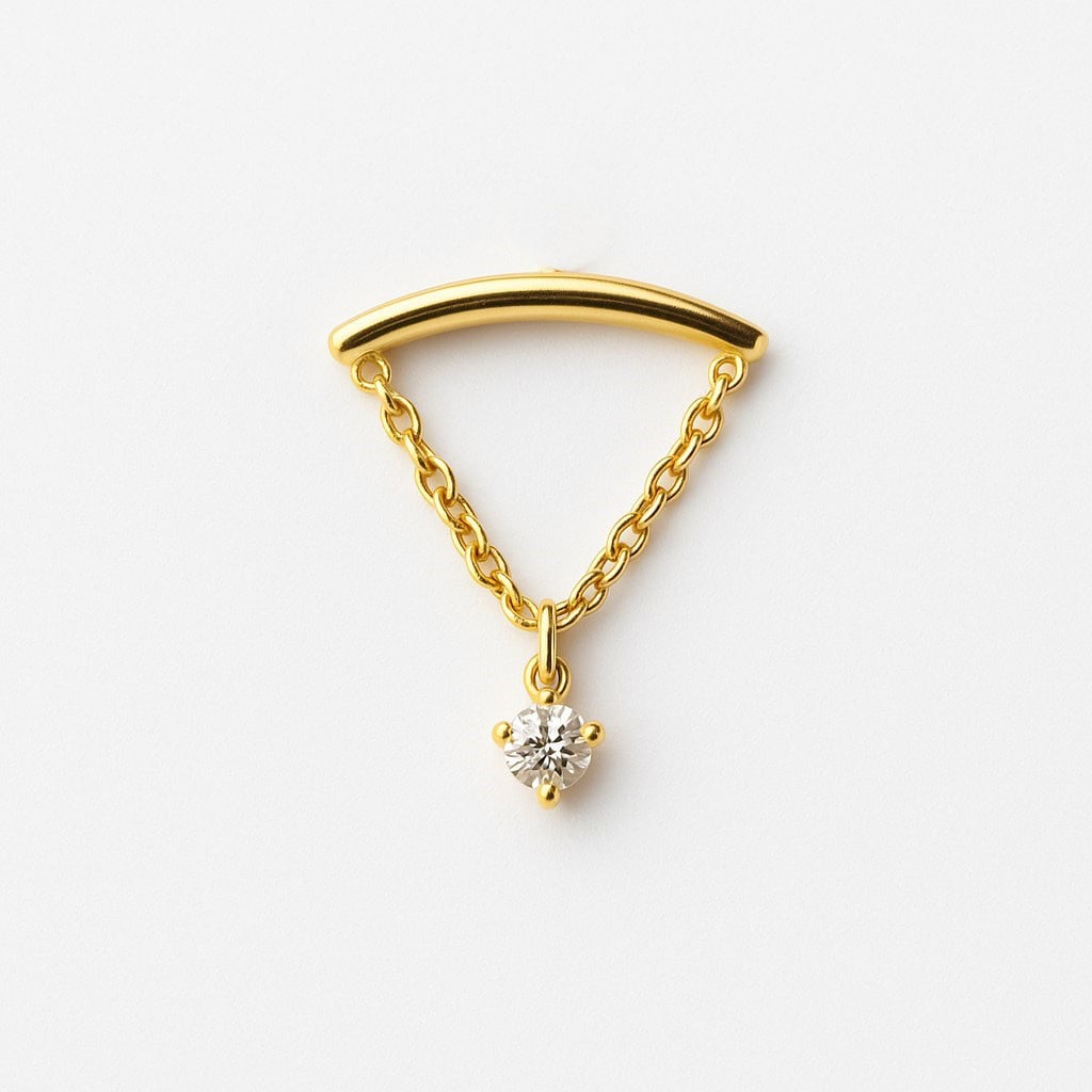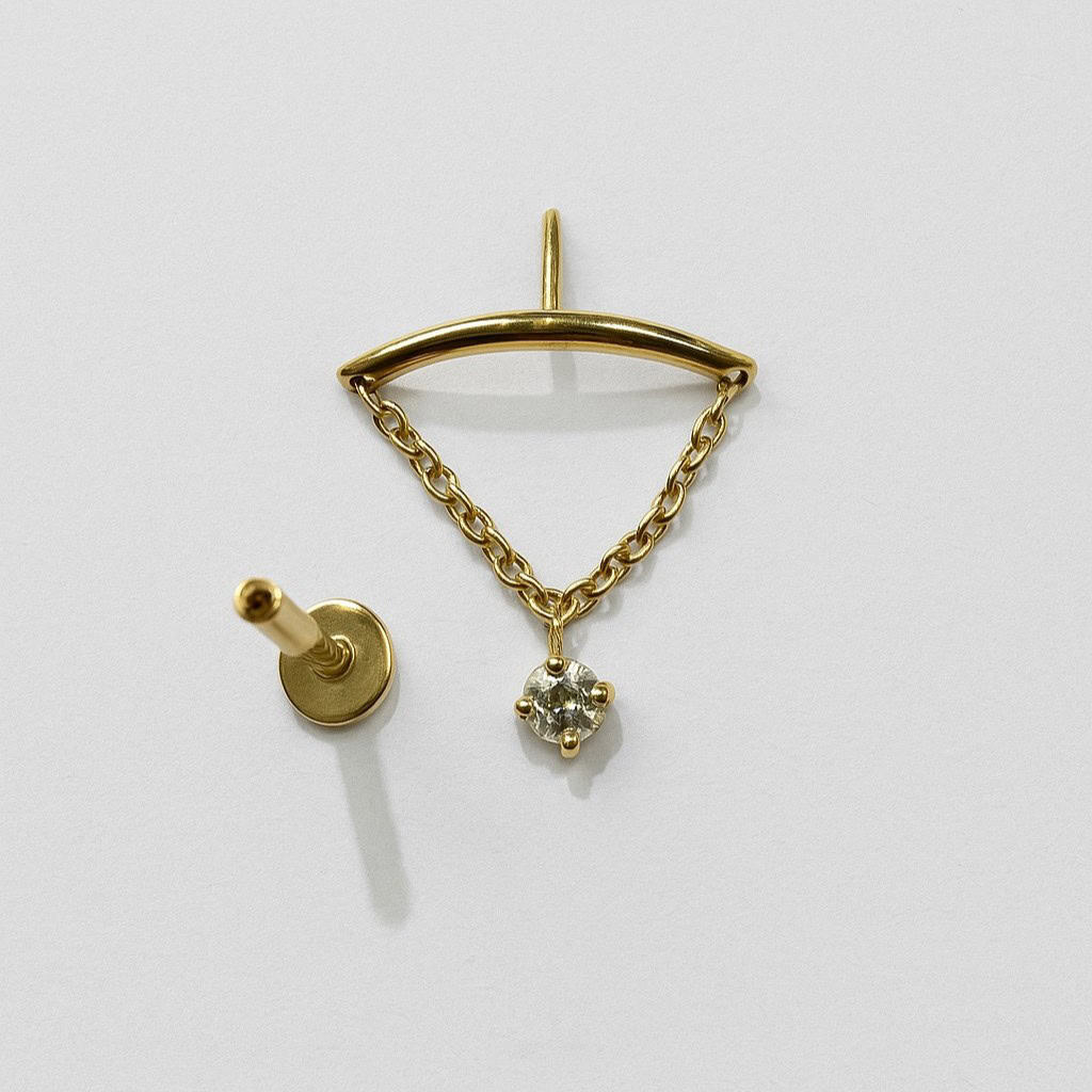 עגיל פירסינג מודרני עם מוט עליון ושרשרת כפולה משולשלת שמחזיקה יהלום לבן בוהק בעיצוב נקי ואלגנטי מתאים ללבישה יומיומית או לאירועים עשוי מחומרי גלם איכותיים לשימוש ממושך ולמראה יוקרתי ועדין. פירסינג יהלומים מזהב (משקל יהלומים כולל 0.05 קראט) בצבע D וניקיון יהלום VS1.