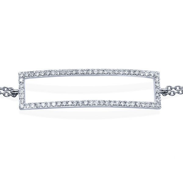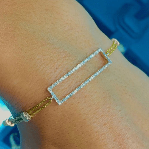 צמיד זהב עם חוליות כפולות ומלבן משובץ יהלומים טבעיים הממוקם במרכז הצמיד המבנה המוארך של המלבן מדגיש את קו היד ומבליט את ברק האבנים לכל אורכו הצמיד מתאים לענידה יומיומית וגם לאירועים ויכול להשתלב עם צמידי זהב נוספים ליצירת מראה מלא נוכחות משקל היהלומים 0.50 קראט