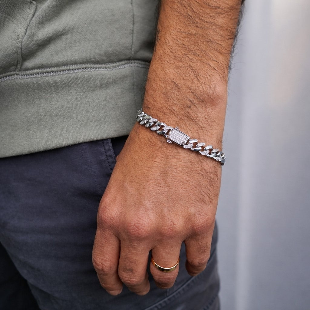 צמיד קובני מזהב לבן עם חוליות משובצות יהלומים טבעיים בעיצוב מרשים