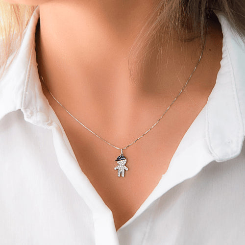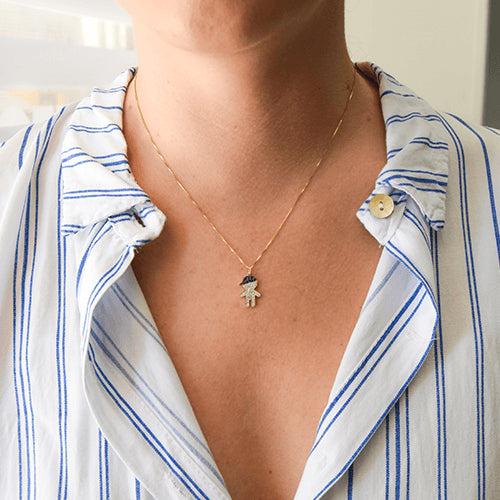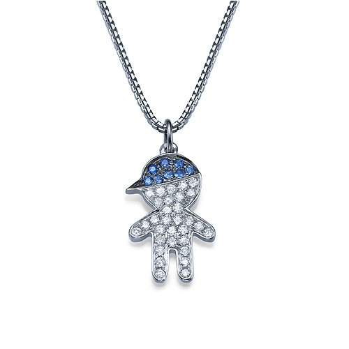 שרשרת ילד מזהב משובצת ספירים כחולים ויהלומים טבעיים בעיצוב עם כובע כחול