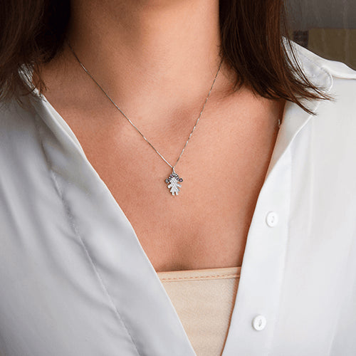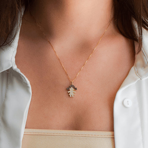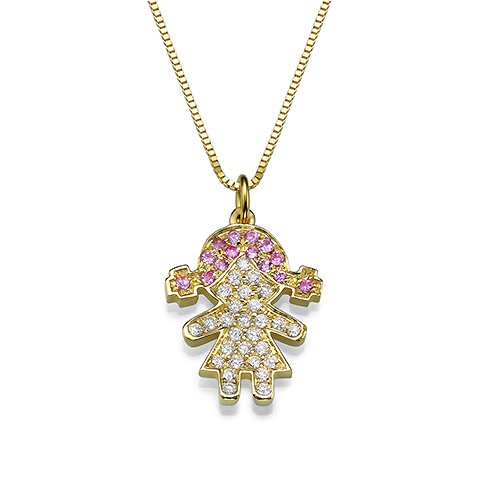 תליון ילדה מזהב משובץ יהלומים וספירים ורודות בעיצוב מתוק מלא משמעות
