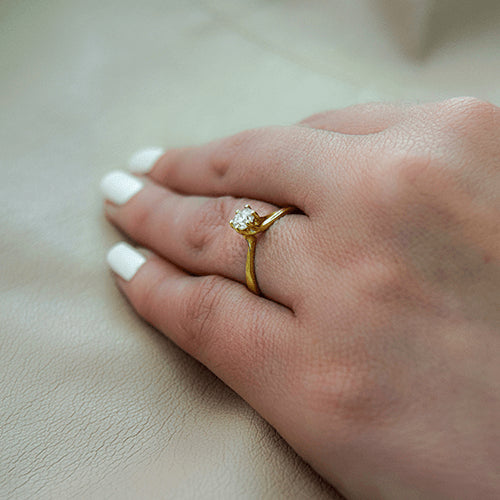 טבעת אירוסין טוויסט סוליטר עם 6 שיניים האוחזות את היהלום בצורה סיבובית ומעניקים לטבעת מראה אלגנטי ונשי. בטבעת אמנדה אפשר לבחור יהלום מרכזי במשקל 0.30 - 0.75 קראט בכל דרגות האיכות. טבעת אירוסין זהב צהוב עם יהלום מרכזי במשקל: 0.41 קראט (משקל יהלומים כולל 0.41 קראט) בצבע F וניקיון יהלום SI1.